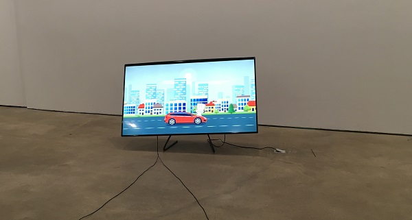 Jotain painavaa oli myös 9 Billion Apps -installaation tyhjyydessä. Keskisormia kaikkialle näyttävä vessanpönttö auton keulakoristeena on ihan osuva symboli Piilaakso-mehustajien ja menestymisneurootikkojen pintaliidolle. Auto itse ei ole menossa mihinkään, vaan kiitää samassa lastenkirjamaisessa maailmassa muutaman sekunnin loopissa. Tunnetta etenemisestä ja sisällöstä pitää yllä vain vessanpöntön toistelema nettibisneksen kliseepuhe.