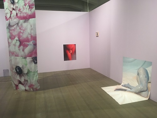 Viimeksi tilassa vieraillessamme kirjoitimme Hertta Kiisken Violetti Meri-näyttelystä, jonka yhteydessä sivusimme sitä, että eräs motiivi tämänhetkisessä (kuva)taiteessa on feminiinisyyden tai tyttömäisyyden haltuun ottaminen. Linda Lehtovirran ja Emilia Pennasen kuvasarja GURLS jatkaa tätä juonnetta. Toinen siinä vaikuttava perinne on 1990-luvulla feministisessä taiteessa merkittäväksi noussut ällöyden ja abjektion estetiikka, joka on läsnä etenkin teoksen suurimmassa kuvassa heleiden kukkien ja jonkin puuromais-eritemäisen sörsselin kontrastina. Kankaille printatut ja näin ikään kuin raameistaan tilaan vapautuneet kuvat ovat siis estetiikaltaan melko tunnistettavia. Silti tai siksi kuvissa näkyvien pintojen ja materiaalien vuoropuhelu sai minut unohtumaan niiden ääreen ja ajattelemaan herkkyyksien ja voimien suhteita katseissa, kehoissa ja ajatuksissa.