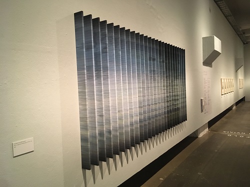 Autiotalot toimivat hyvänä johdatuksena metafyysisempiin aiheisiin. Jussi Nahkurin suuri teos 983 congested landscapes of 20th July paneutuu ajan kuvaamisen problematiikkaan, joka on – uskaltaisin väittää – yleensäkin valokuvaamisen ytimessä. Nahkurin teos muistuttaa lamelliverhoa, jonka ohuissa säleissä näyttäisi olevan häivähdys järven pinnasta heijastuvaa taivasta. Teos tavoittaa tarkasti pysäytetyn liikkeen tunnun, joka syntyy teoksen väreillessä silmien edessä kuin jokin illuusioon pyrkivä optinen koje. Kiinnostavaa, miten aika, silloin kun se pyritään kuvaamaan materiaalisena, usein näyttäytyy jonkinlaisina venyvinä palkeina tai laskoksina. Niin myös tässä.
